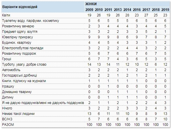 •     серед жінок 12% не чекають від чоловіків жодних подарунків, крім турботи і уваги, однак лише 6% чоловіків відзначили цей пункт;