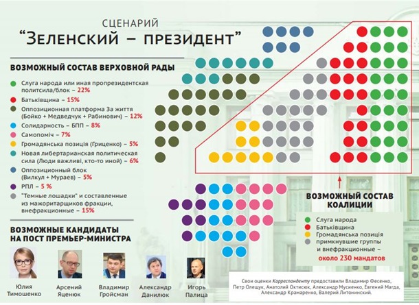 Прилаштуватися до Зеленського зараз багато охочих, особливо серед політиків, які намагаються тримати ніс за вітром і готують плацдарм на майбутні кампанії. Однак експерти не прогнозують, що перебіжки в умовну «групу Зеленського» в поточному скликанні парламенту будуть масовими. Серед тих, хто може «злитися» під Зеленського, найчастіше називають частину Народного фронту. Рейтинги цієї політсили гнітючі і змушують її членів шукати більш успішні бренди для розвитку своїх політичних кар'єр. Але якогось переформатування парламентської більшості під Зеленського очікувати не варто. Отже, Кабінет Міністрів до жовтня 2019 року, кого б не обрали президентом, не зазнає змін.