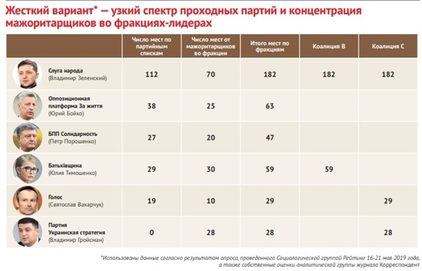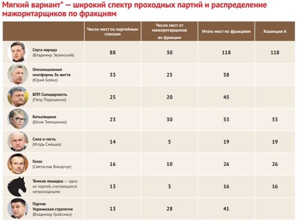Навряд чи Слуга народу отримає більшість у Раді одноосібно. А тому доведеться шукати союзників. Якщо сумарно фракція не збере хоча би 140 голосів, доведеться збирати коаліцію мінімум із чотирьох учасників (див. Таблиці). Якщо ж більше 170 - можна буде домовлятися з Батьківщиною Юлії Тимошенко. Або з парою партій-новачків.