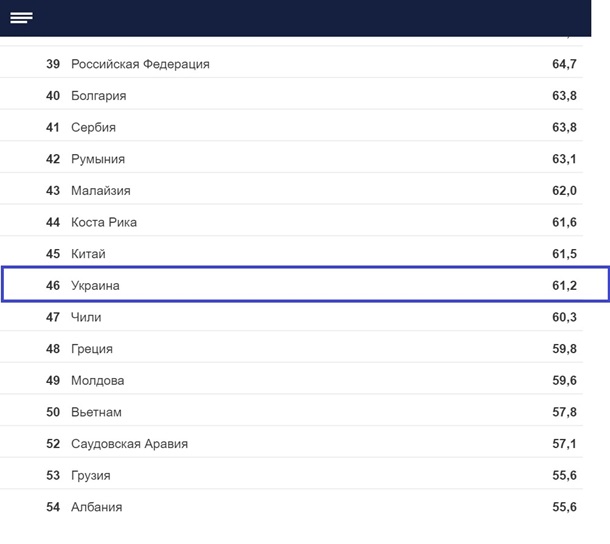 Сусіди України розташувалися в такому порядку: Польща - 30 місце (69,1 бала), Словаччина - 32 (68,5), Угорщина - 37 (65,5), Росія - 39 (64,7), Румунія - 42 (63 , 1), Молдова - 49 (59,6).