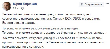 Бірюков написав у Facebook повідомлення на тлі новин про пропозицію президента Володимира Зеленського ввести спільне патрулювання Донбасу силами української армії, ОБСЄ та представників так званих "ЛДНР".