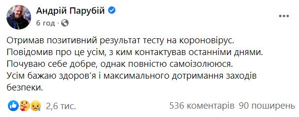 "Отримав позитивний результат тесту на короновірус. Повідомив про це усім, з ким контактував останніми днями. Почуваю себе добре, однак повністю самоізолююся. Всім бажаю здоров'я і максимального дотримання заходів безпеки", - написав депутат.