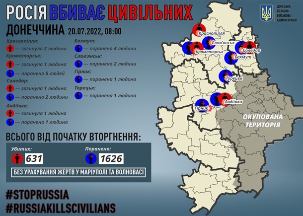 "За 19 липня росіяни вбили п'ятьох мирних жителів Донеччини - двох у Краснопіллі, одного в Краматорську, одного в Соледарі та одного в Авдіївці. Ще 16 людей зазнали поранень", - уточнив він.