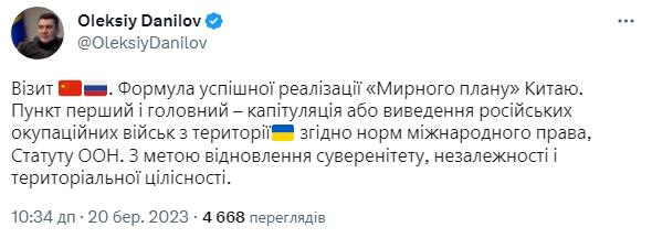 Секретар Ради національної безпеки і оборони України Олексій Данілов прокоментував візит глави КНР Сі Цзіньпіня до Москви, заявивши, що головним пунктом "мирного плану" Китаю щодо України має бути виведення російських військ з території країни. Про це він написав у Twitter 20 березня.