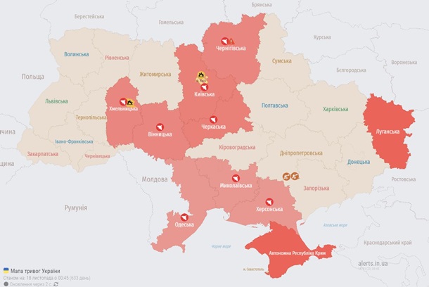У ніч проти суботи, 18 листопада, РФ атакує Україну дронами-камікадзе. Повітряна тривога лунала у низці центральних областей.