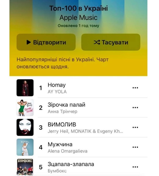 Зараз Homay "обігнала" всі україномовні пісні в Apple Music та лідирує в чарті. Як відомо, прослуховування треків на стримінгових сервісах монетизується. Відповідно, за це російські виконавці отримують гроші, якими потім сплачують податки в Росії або напряму спонсорують війну в Україні.