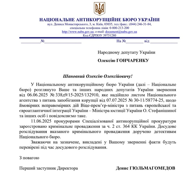 "Її підозрюють у зловживанні владою або службовим становищем, яке спричинило тяжкі наслідки (ч.2 ст. 364 КК України). Про це йде мова у відповіді НАБУ на моє звернення. Провадження було відкрито 11 червня 2025 року. Досудове розслідування проводять детективи НАБУ", – написав він і оприлюднив фото відповіді САП на депутатське звернення.