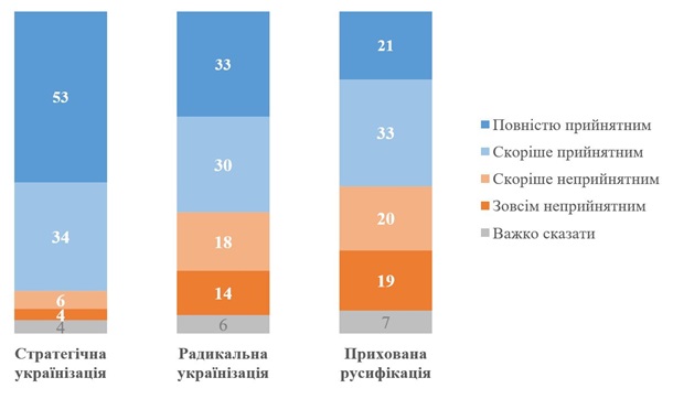 Прихована русифікація: схвалюють 54% респондентів, але тільки 21% вважають її повністю прийнятною. Противники складають 39%. Варіант не є консенсусним, бо підтримується переважно на Сході та Півдні, а на Заході більшість його відкидає. Серед українськомовних думки розділилися порівну.