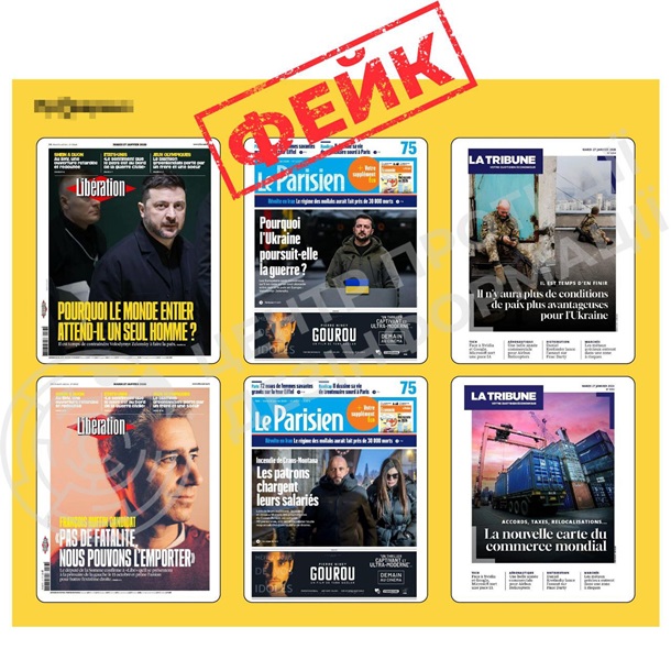 Зазначається, що в одній із програм на російському Первом канале ведучий заявив, що нібито одразу два провідні французькі видання - Libération та Le Parisien - розкритикували президента України Володимира Зеленського за "недоговороспроможність", демонструючи фейкові перші шпальти з відповідними заголовками.