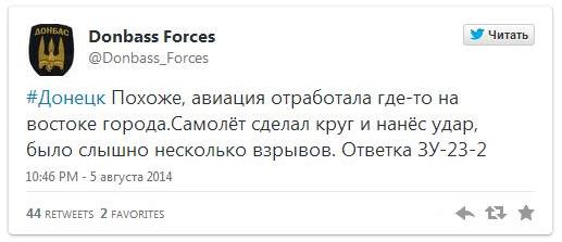 Очевидці з місця подій повідомляють в соцмережах, що над Донецьком працювала авіація. "Донецьк. Літаків було два, зробили коло, скидання бомб, і знову коло, і знову скидання. В районі набережної скинули бомби, а в район Бутівки від літака пішла ракета нетеплова, бо йшла рівно зверху вниз", - пишуть очевидці.