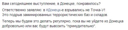 "Вам сьогоднішній виступ, у Донецьку, сподобався? Відповідально заявляю: у Донецьку вибухали не Точка-У! Це підрив замінованих терористичних баз і складів. Тепер ми будемо це робити регулярно, поки ви не підете з Донецька добровільно або вас будуть вивозити "примусово", - йдеться в повідомленні.