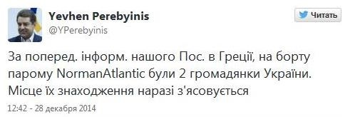"За попередньою інформацією українського посольства в Греції, на борту порома Norman Atlantic були 2 громадянки України", - написав Перебийніс у Twitter в неділю.