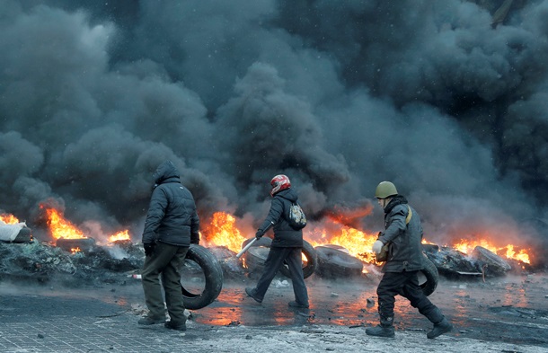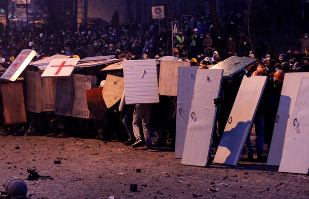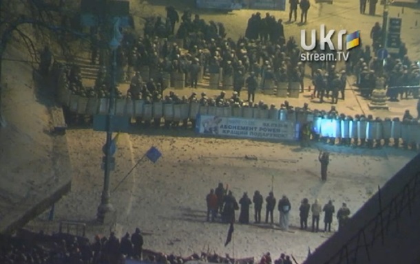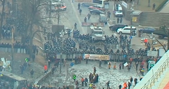 9:08 У Києві на вулиці Грушевського кілька десятків людей в масках з імпровізованими щитами намагалися прорвати кордон спецназівців біля стадіону імені Лобановського. Правоохоронці застосовують проти атакуючих шумові гранати і стріляють з пневматичної зброї.