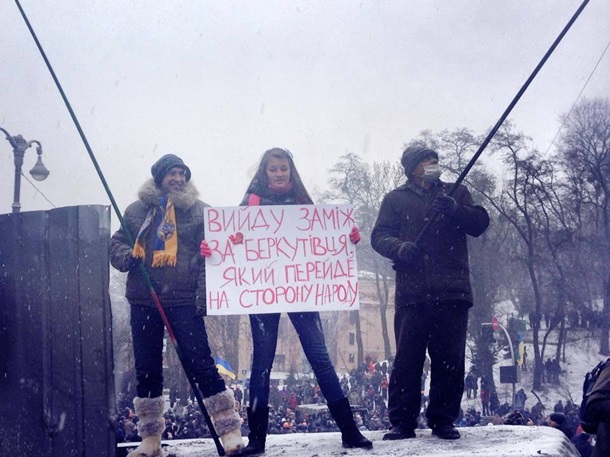 17:10 На Грушевського відчайдушна дівчина тримає в руках плакат зі зверненням до беркутівців.