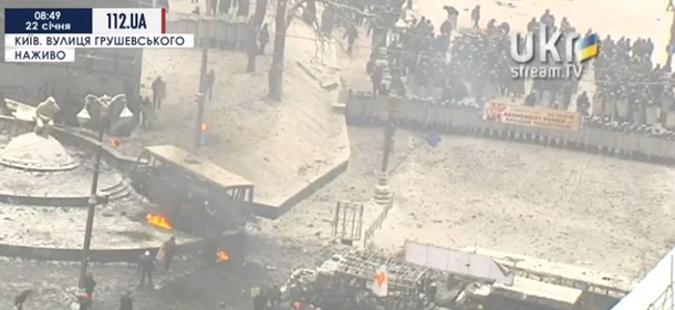 18:00 Частина барикади, яку звели мітингувальники на Грушевського, загорілася. За останню годину мітингувальникам вдалося відтіснити міліцію подалі від барикади. Люди активно застосовують коктейлі Молотова і петарди.