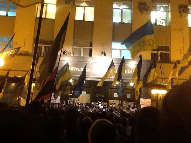 Вимоги протестувальників на вулиці Різницькій 13/15 - звільнити дев'ятьох затриманих, яких заарештували за зіткнення біля Адміністрації Президента на Банковій. Головне гасло акції - Переступили через закон - переступайте через українських громадян.