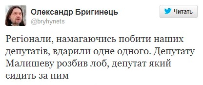 "Регіонали, намагаючись побити наших депутатів, вдарили одне одного. Депутату Малишеву розбив лоб депутат, який сидить за ним", - повідомив Бригинець.