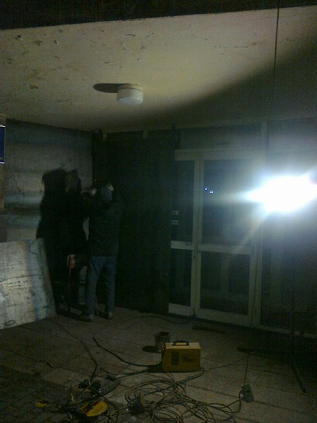 6:40 На схилі біля колонад біля входу на стадіон Динамо ім. Лобановского час від часу мітингувальники запускають з установок феєрверки у бік Беркута, а силовики в свою чергу відповідають світлошумовими гранатами і стріляють гумовими кулями. Також територію схилу і барикади на вул. Грушевського освітлюють з боку міліціонерів кілька великих прожекторів.