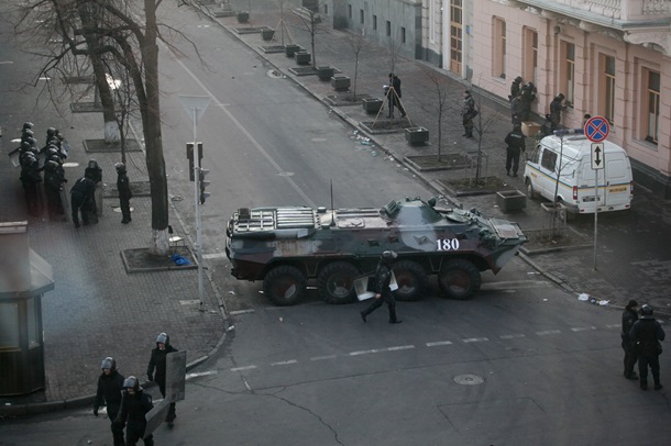 9:08 У Києві на вулиці Грушевського кілька десятків людей в масках з імпровізованими щитами намагалися прорвати кордон спецназівців біля стадіону імені Лобановського. Правоохоронці застосовують проти атакуючих шумові гранати і стріляють з пневматичної зброї.
