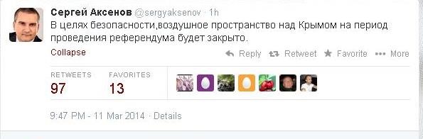 Повітряний простір Криму закриють для польотів в день референдуму 16 березня, заявив самопроголошений прем'єр Криму Сергій Аксьонов у своєму Twitter в середу, 12 березня.