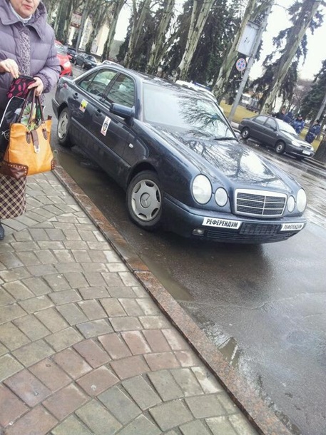 13:26 Машина припаркована на площі Леніна. Донецьк. Номерів немає. Наклейки "референдум", "беркут", прапор Донецька.