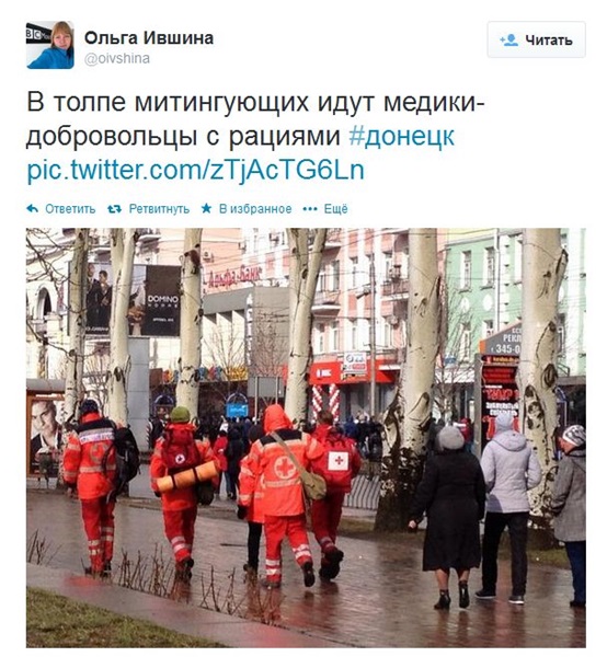 Над площею віються російські триколори, георгіївські стрічки і прапори "Донецької республіки". Люди скандують: "Донбас — Росія", "Таруту — геть", "Беркут " і "Губарєв".