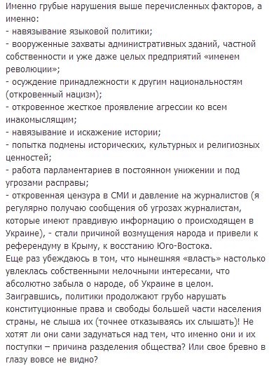"Ще раз переконуюся в тому, що нинішня "влада" настільки захопилася своїми дріб'язковими інтересами, зовсім забула про народ, про Україну в цілому... Якщо новоспечені "керівники" України не зупиняться і продовжать вести себе таким відверто бандитським чином, ще й даючи неправдиву інформацію європейським чиновникам, невдовзі вони самі стануть заручниками своїх дій. Не думаю, що їм сподобається реакція світової спільноти. Є гарна стара приказка: "усе таємне, рано чи пізно, стає явним!", - резюмував він.