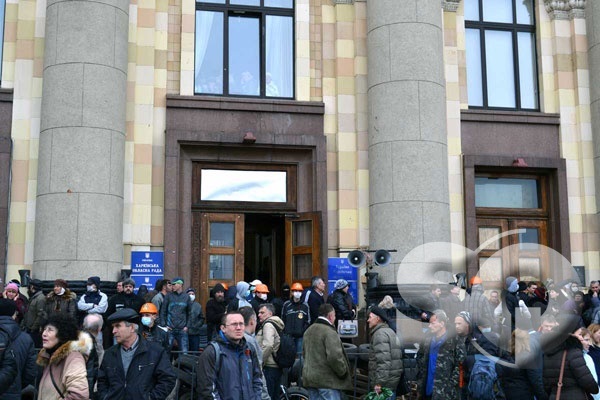 На майданчику перед будівлею обладмінстрації - мітинг проросійськи налаштованих активістів. Спочатку вони вимагали, щоб депутати облради протягом трьох годин, до 12:00, прибули і провели сесію, на якій висловили б свою позицію "щодо майбутнього України", передає видання.