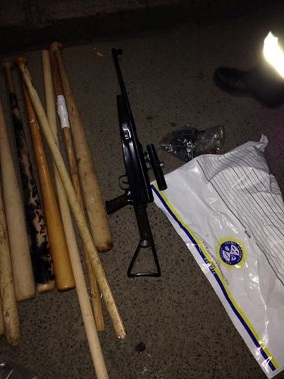 Зокрема, очевидець опублікував фотографії з вилученими предметами біля пам'ятника Ольшанцям. На них можна розглянути бейсбольні бити, палиці, сокиру, а також автомат.