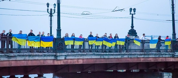 Присутні активісти стояли на мосту з прапорами України, а машини, що проїжджали поруч, сигналили. Незважаючи на нечисленність, молоді люди, які брали участь в стихійному флешмобі, заспівали гімн і скандували "Донбас - це Україна!", "Слава Україні - Героям слава!".
