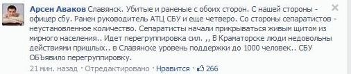 "З нашого боку - офіцер СБУ. Поранений керівник АТЦ СБУ і ще четверо. З боку сепаратистів - невстановлена кількість. Сепаратисти почали прикриватися живим щитом з мирного населення. Йде перегрупування сил. У Краматорську люди незадоволені діями прийшлих. У Слов'янську рівень підтримки до 1000 осіб. СБУ оголосило перегрупування", - повідомив міністр.