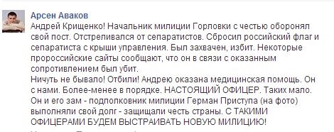 “Андрій Крищенко! Начальник міліції Горлівки з честю обороняв свій пост. Відстрілювався від сепаратистів. Скинув російський прапор і сепаратиста з даху управління. Був захоплений, побитий. Деякі проросійські сайти повідомляють, що він у зв'язку з наданим опором був убитий. Анітрохи не правда! Відбили! Андрію надана медична допомога. Він з нами. Більш-менш впорядку”, - написав міністр.