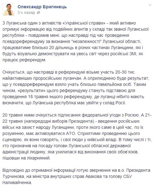 "Насправді під час проведення (11 травня - прим.ред.) псевдореферендуму за визнання "незалежності" Луганської області працюватиме близько 20 дільниць у різних частинах Луганщини, які й будуть візуально демонструвати на весь світ через російські ЗМІ, як працює референдум. Очікується, що насправді у референдумі візьме участь 20-30 тисяч активних проросійських луганчан. А буде оприлюднений результат, що в псевдореферендумі взяло участь близько півмільйона людей", - написав Бригинець.