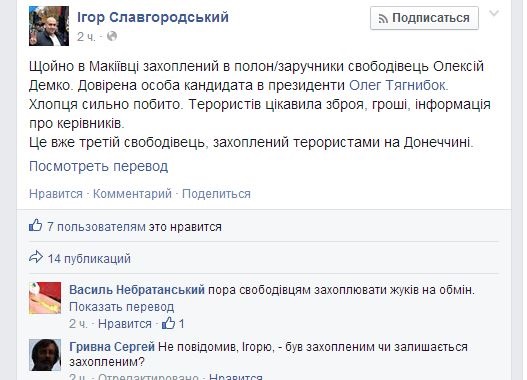 «Щойно в Макіївці був захоплений у полон/заручники свободівець Олексій Демко. Довірена особа кандидата в президенти Олега Тягнибока. Хлопця сильно побили. Терористів цікавила зброя, гроші, інформація про керівників », - написав Славгородський.