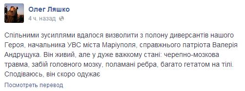 "Спільними зусиллями вдалося звільнити з полону начальника УВС міста Маріуполя Валерія Андрущука. Він живий, але в дуже важкому стані", - написав він.