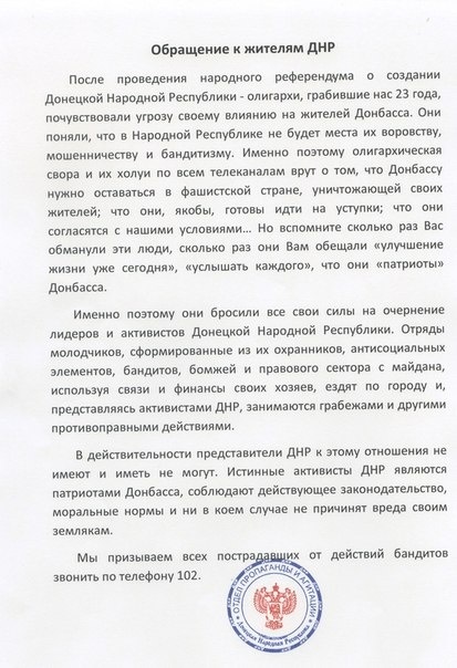"Загони молодчиків, сформовані з їхніх охоронців, антисоціальних елементів, бандитів, бомжів і Правого сектору з Майдану, використовуючи зв'язки і фінанси своїх господарів, їздять по місту і, називаючись активістами ДНР, займаються грабежами та іншими протиправними діями", - сказано в повідомленні.