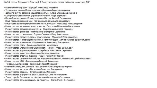 Повідомляється, що першим віце-прем'єром обраний один із лідерів Донецької народної республіки Андрій Пургін, а головою парламенту - Денис Пушилін. Міністром економрозвитку призначений Володимир Подгорний.