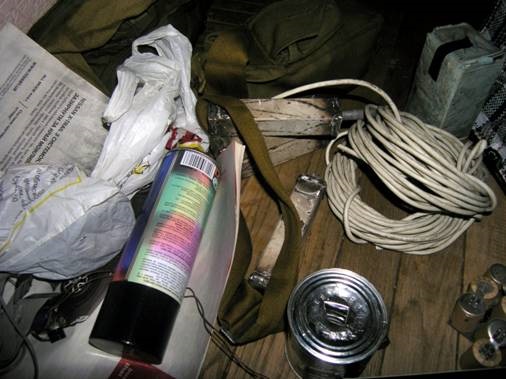 У квартирі затриманих були виявлені компоненти для виготовлення вибухових пристроїв (порох, селітра, ацетон, бікфордові шнури, металеві контейнери, годинникові механізми і т.д.) в такій кількості, що вибухо-технічні служби були змушені евакуювати жителів будинку.