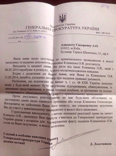 "З урахуванням викладеного, з метою належної реалізації права на захист Климека О.В., пропоную Вам прибути з'явитися до генеральної прокуратури України разом з останнім для підтвердження факту Надання Клименком О.В. згоди на Ваше залучення, в якості захисника", - пише слідчий. (збережено оригінальний текст листа).