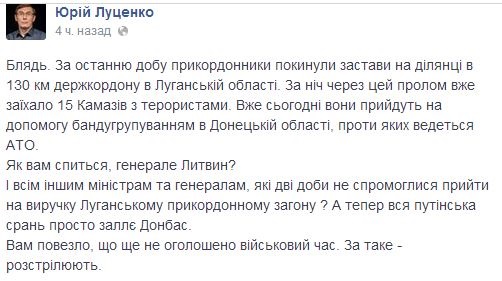 "За останню добу прикордонники залишили заставу на ділянці за 130 км держкордону в Луганській області. За ніч через цей пролом вже в'їхали 15 КАМАЗів з терористами", - написав Луценко.