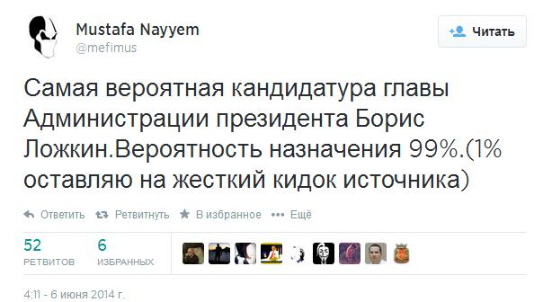 "Найбільш вірогідна кандидатура глави Адміністрації Президента Борис Ложкін. Імовірність призначення 99%. (1% залишаю на жорсткий кидок джерела)", - повідомив Найєм.