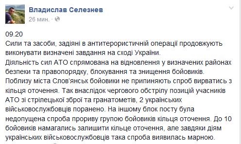 "Поблизу міста Слов'янськ бойовики не припиняють спроб вирватися з кільця оточення. Так, в результаті чергового обстрілу позицій учасників АТО зі стрілецької зброї і гранатометів 2 українських військовослужбовців поранені", - написав Селезньов своїй сторінці у Facebook.