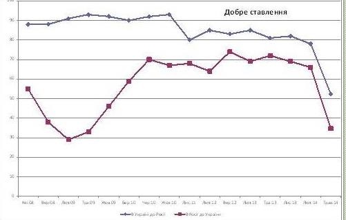 У порівнянні з лютневим опитуванням кількість позитивно налаштованих до Росії українців різко впала (з 78% у лютому до 52% - у травні). Кількість же українців, які негативно ставляться до Росії, зросла майже втричі (13% у лютому, 38% - у травні).