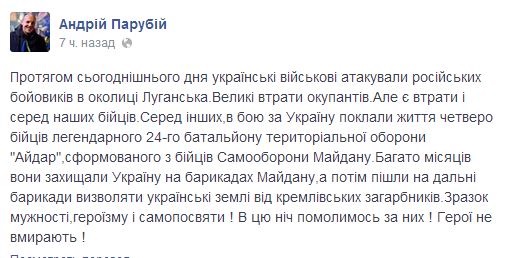 "Українські військові атакували російських бойовиків в околицях Луганська. Великі втрати серед окупантів, але є втрати і серед наших бійців. У бою поклали життя четверо бійців легендарного 24-го батальйону територіальної оборони Айдар, сформованого з бійців Самооборони Майдану. Помолимося за них! Герої не вмирають", - написав Парубій.