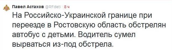 Уповноважений при президенті РФ з прав дитини Павло Астахов повідомляє, що автобус з дітьми був обстріляний на україно-російському кордоні.