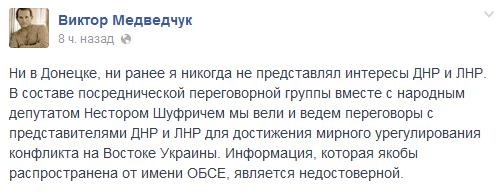 "Ні в Донецьку, ані раніше я ніколи не представляв інтереси ДНР і ЛНР. У складі посередницької переговорної групи разом з народним депутатом Нестором Шуфричем ми вели і ведемо переговори з представниками ДНР і ЛНР для досягнення мирного врегулювання конфлікту на сході України. Інформація, яка нібито поширена від імені ОБСЄ, є недостовірною", - наголосив він.
