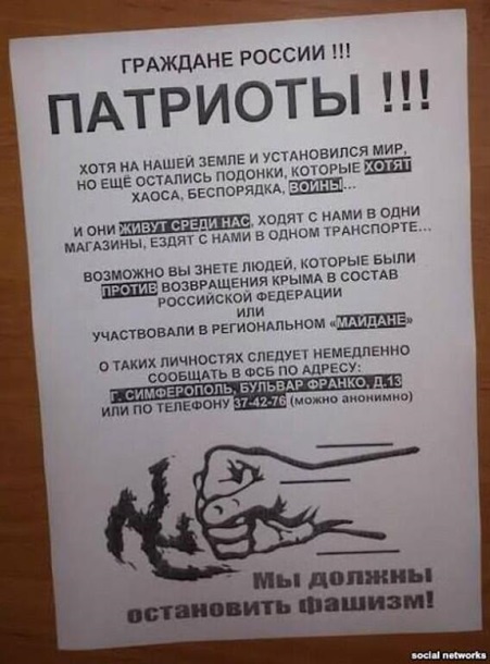 Як наголошується в листівках, "громадяни Росії" повинні зупинити фашизм, повідомивши в регіональне управління ФСБ РФ про всіх учасників "Майдану" і тих, хто є противником "повернення Криму до РФ".