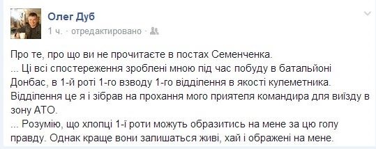 Боєць добровольчого батальйону Донбас Олег Дуб розповів про проблеми батальйону. Про це він написав на сторінці у Facebook.