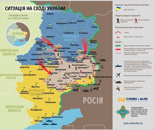 Також про бої в цих регіонах свідчить карта актуальних дій АТО станом на 23 липня, опублікована РНБО.