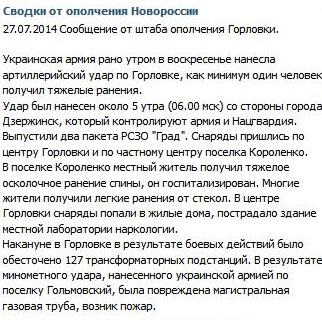 У свою чергу, у штабі "ополчення" Горлівки повідомляють, що рано вранці в неділю українська армія завдала артилерійського удару по Горлівці, як мінімум одна людина отримала важкі поранення.